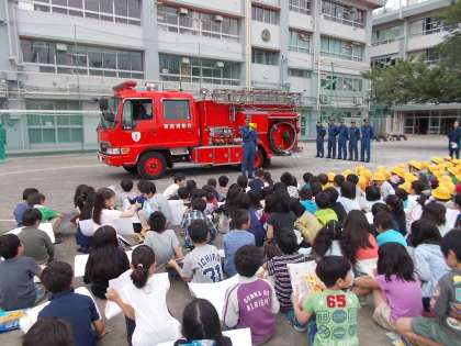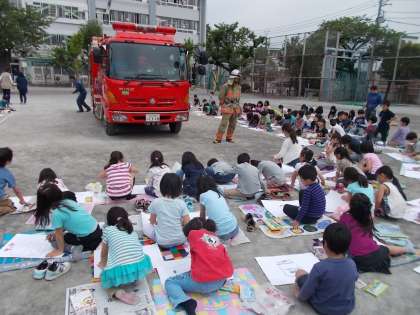 今日は1・2年生合同の消防自動車写生会でした。2台の消防自動車の大きさに驚きました。興味をもって楽しく取り組みました。