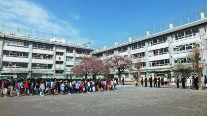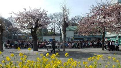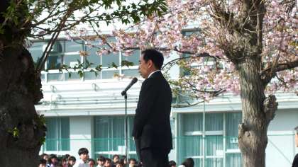桜の花がきれいに咲く中、平成27年度の始業式が行われ、一つずつ進級した子どもたちの笑顔と元気な声が学校に戻ってきました。始業式では、本年度本校に赴任した 鈴木 稔校長より、「あいさつとしっかりとした返事」について話がありました。