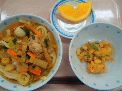 今日の献立 ・ 五目うどん ・ 新じゃがと大豆のごまそぼろ煮