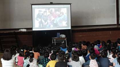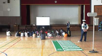 碑文谷警察署からお二人のおまわりさんにおいでいただき,1年生が「交通安全教室」を行いました。映像をみてお話を伺ったり,体育館に設置していただいた“信号機のある横断歩道”を渡ってみたりして,交通事故から自分の命を守るための学習をしました。