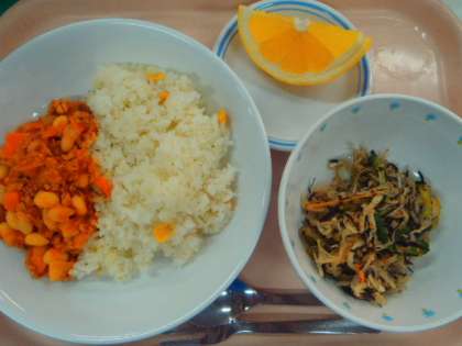 給食では、大豆といんげん豆を加えて、ガーリックライスに合わせてみまし