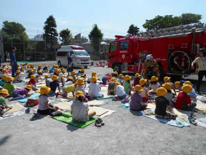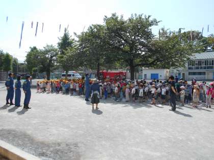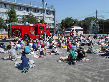 晴れた空の下、校庭で1・2年生の消防写生会が行われました。