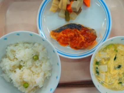 今日の献立 ・ピースごはん ・鰆のチリソース