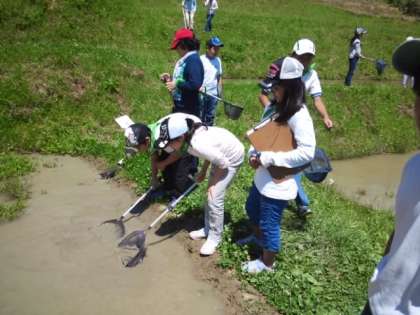 カエルやザリガニ、イモリをつかまえて大騒ぎです。