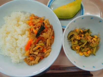 ・ごはん ・高野豆腐と豚肉の炒めもの ・ツナと海藻のサラダ
