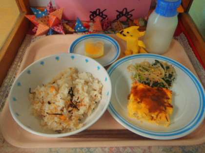 ご飯には、「揚げ大豆、昆布、ごま」和え物にも「ごま、ちりめんじゃこ」が入っていました。