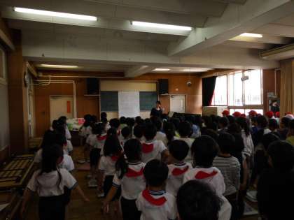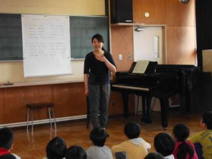 1年生全員で、音楽の先生から校歌と運動会の歌を教わりました。