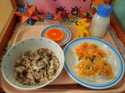 今日は、ひじきとじゃこのふりかけを配る時間を短縮できるように混ぜごはんにして出しました。ゆかりも入っていたので、暑い今日でしたが食べられていたようです。