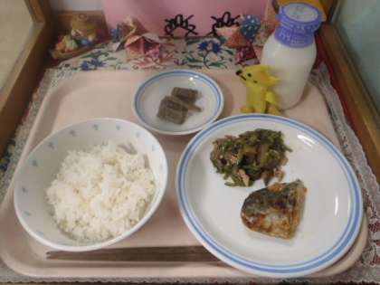 ごはん・さごしの梅みそマヨネーズ・なべしぎ・たたきごぼう・牛乳