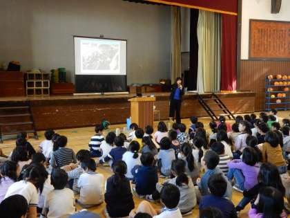 世界の貧しい国の現状や、そこで暮らす同年代の子どもたちの生活について、パワーポイントを使って紹介してもらいました。