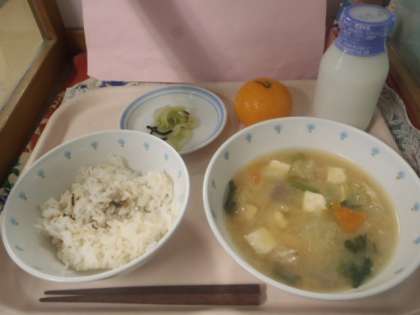 昆布ごはん・石狩汁・白菜の浅漬け・くだもの(みかん)・ぎゅうにゅう