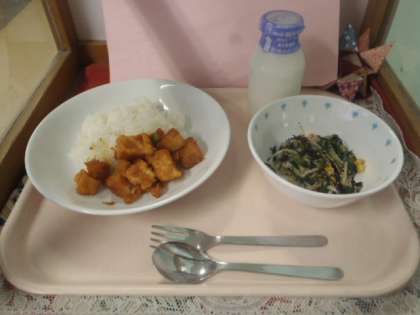 ごはん・生揚げとポテトのチリソース・ひじきと野菜のサラダ・ぎゅうにゅう