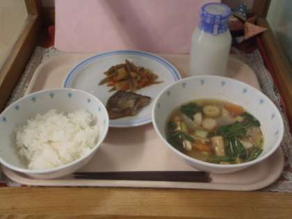 12月になりました。今日は寒くて温かいものが食べたくなりますね。五目汁はたくさんの具を入れ、しょうゆ味にしました。とろみを少しつけて、ほんのり生姜の香りで温まる汁物にしました。サバもしっかり味をしみこませ、味噌煮の残った汁にとろみをつけて上からかけて提供しました。きんぴらは今年度の定番メニューの一つです。子供たちの大好きなメニューの一つです。とてもよく食べてくれました。