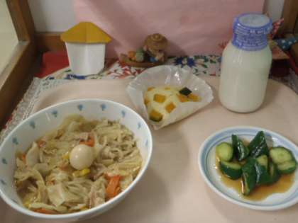 みそラーメン・中華風きゅうり・かぼちゃ蒸しパン・ぎゅうにゅう