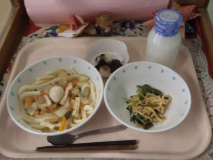 ちゃんぽんうどん・茎わかめとじゃこの香味和え・あずきだんご・ぎゅうにゅう