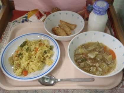 1月12日の給食 公開日 2018/01/12 更新日 2018/01/12 給食 【今日の献立】 メキシカンライス・やさいスープ・フライドポテト・ぎゅうにゅう 【主な食材と産地】 豚肉(岩手)ベーコン(茨城群馬千葉)玉ねぎ(北海道)にんじん(千葉)ピーマン(宮崎)セロリ(静岡)白菜(兵庫)じゃが芋(北海道) いいね(0)