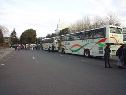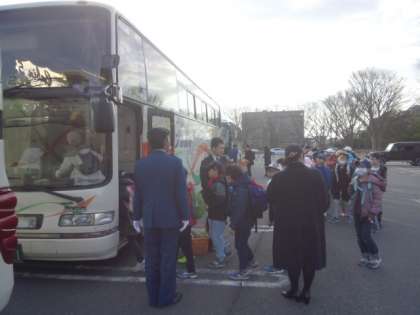 4年生は社会科見学に出発しました。バス3台に分乗しています。