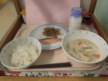 ごはん・豆乳味噌汁・サケの塩焼き・じゃが芋の金平・ぎゅうにゅう