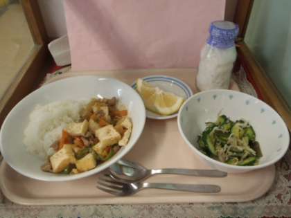 ごはん・厚揚げと豚肉のみそ炒め・きゅうりとわかめの酢の物・くだもの(日向夏)・ぎゅうにゅう