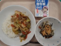 ・大豆おこわ ・お麩じゃが ・卵と野菜の五目炒め ・牛乳