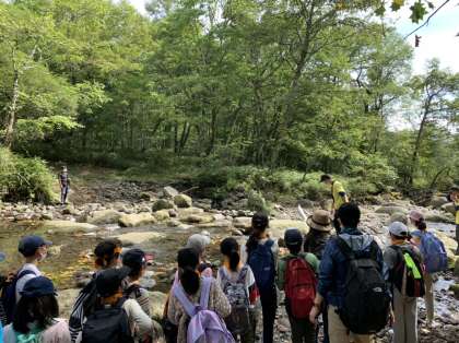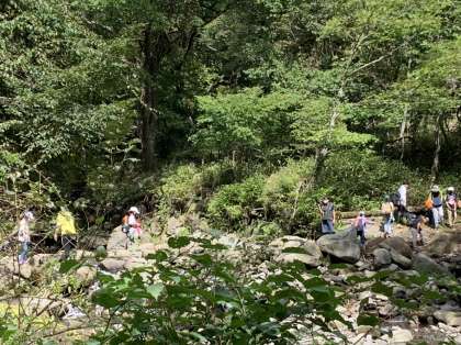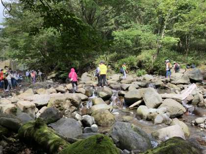 ハイキングの途中では、川を渡る場面もありました。