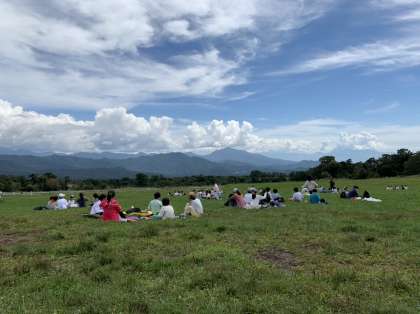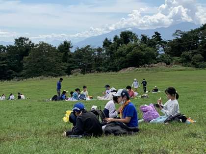 クラス写真をとった後、待ちに待ったランチタイム。宿舎の方のご厚意で、お弁当は清泉寮に運んでいただいたので、1人ひとりお弁当をもらって、広場で食べました。