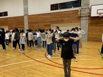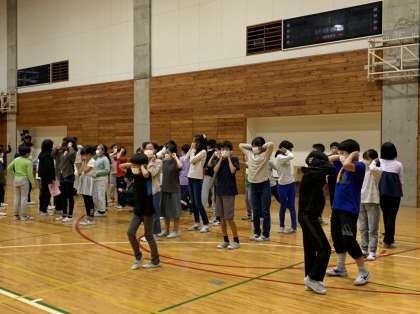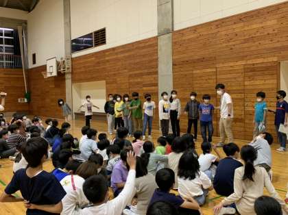 伝言ゲームでは、レク係が見本を見せ、5秒以内に相手にジェスチャーで答えます。