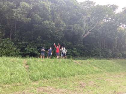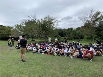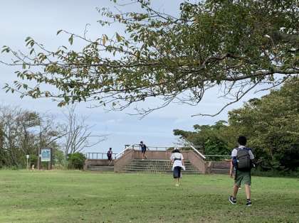 大房岬でスコアオリエンテーリングを行なっています。行動班で協力して、地図をたよりに各ポイントに示されたキーワードを集めています。
