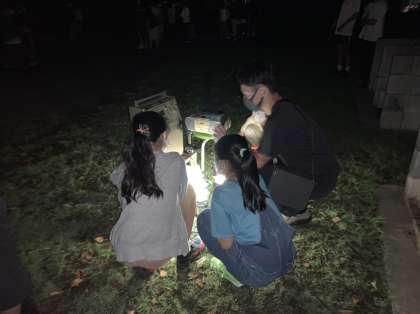 夕食後、グラウンドに出て、キャンプファイヤーをしました。グラウンドに出るのは今回が初めて。はじめに、火の神から、勇気、希望、団結の3つの火をもらいました。そのあと、レク係が準備してきたゲームやクイズを行いました。