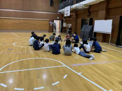キャンプファイヤーを終え、パジャマに着替えたり、部屋の片付けをしたりする時間となりました。室長さんは、その間に、体育館で会議です。今日一日を振り返りをしていました。