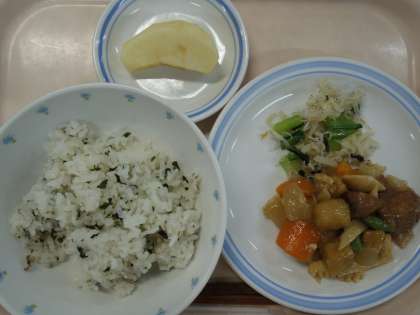 10月7日の給食 公開日 2022/10/07 更新日 2022/10/07 給食 ・わかめごはん ・高野豆腐とかつおの治部煮風 ・野菜とじゃこの酢の物 ・果物(りんご) しょうが(高知) 鶏肉(岩手) にんじん・玉ねぎ(北海道) さやいんげん(青森) 小松菜(千葉) もやし(栃木) りんご(長野) 今日は目黒区の友好都市、石川県の郷土料理「治部煮」です。給食ではかつおと高野豆腐を唐揚げにして、野菜と一緒に合わせました。 りんごは秋映えという品種でした。 いいね(0)