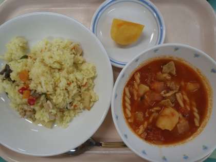 ・パエリア ・トマトと豚肉のスープ ・くだもの(柿) ・牛乳