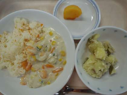 10月17日の給食 公開日 2022/10/17 更新日 2022/10/17 給食 ・エビクリームライス ・ポテトのホットベーコンサラダ ・果物(柿) ・牛乳 にんじん・玉ねぎ(北海道) 鶏肉(岩手) むきえび(マレーシア) パセリ(長野) じゃがいも(北海道) さやいんげん(山形) 柿(奈良) 今日は、エビの入ったクリームソースをごはんと一緒に食べます。ごはんにはにんじんを刻んで一緒に炊き、オレンジ色のごはんにしました。 いいね(0)