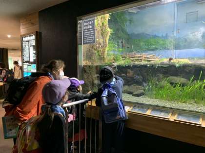 水生物館の中では、かえる、あゆ、かめ、ヤモリ、イモリ、クモなどいろいろな種類の生物がいました。草陰にいる生き物を見つけて、大喜びでした。