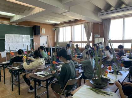 日本の伝統文化の一つでもある華道の歴史について、話を聞いたあど、1人ずつ、花器に花を生けました。