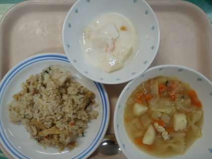 10月24日の給食 公開日 2022/10/24 更新日 2022/10/24 給食 ・じゃこべぇピラフ ・りぼんパスタ入りスープ ・フルーツヨーグルト ・牛乳 にんにく(青森) にんじん(北海道) 小松菜(東京) 玉ねぎ・じゃがいも(北海道) キャベツ(群馬) パセリ(千葉) 今日は、リボン型のパスタ「ファルファッレ」を入れたスープです。イタリア語でちょうちょを表す言葉から付いた名前です。蝶ネクタイのような形なので子どもたちに分かりやすいようにりぼんパスタと表記しました。 いいね(0)