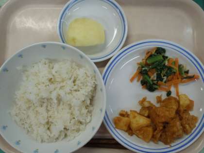 10月25日の給食 公開日 2022/10/25 更新日 2022/10/25 給食 タラ(アメリカ) しょうが(高知) じゃがいも(北海道) にんにく(青森)玉ねぎ(北海道) 小松菜(東京) もやし(栃木) にんじん(北海道) 長ねぎ(青森) りんご(長野) 今日の主菜は、白身魚とじゃがいもにチリソースを絡めました。トウバンジャンやケチャップでチリソースを作りますが、辛さは控えめです。 今日のりんごはシナノスイートという品種です、長野県から届きました。 いいね(0)