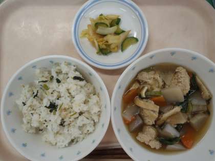 ・青菜とじゃこの混ぜごはん ・鶏団子のけんちん汁 ・白菜のしょうが醤油かけ ・牛乳