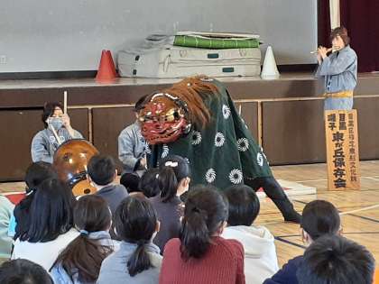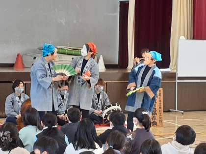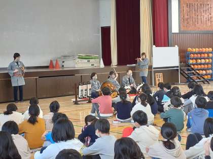 4年生は1.2時間目、5年生は3.4時間目にめぐろ囃子の鑑賞と体験をしました。