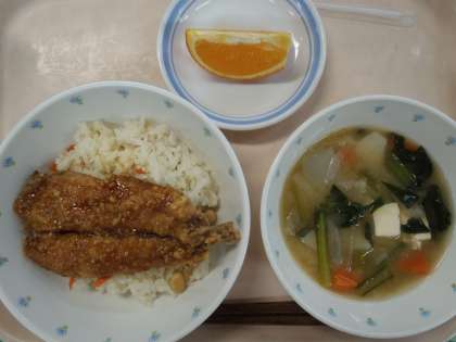 ・福豆ごはん ・いわしの蒲焼き ・具だくさんのみそ汁 ・果物(天草オレンジ) ・牛乳