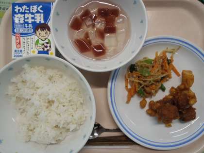 6月1日の給食 公開日 2023/06/01 更新日 2023/06/01 給食 ・ごはん かつおの甘辛揚げ ・ごま和え ・あじさいゼリー ・牛乳 かつお(宮城) しょうが(高知) じゃがいも(長崎) 小松菜(東京) もやし(栃木) にんじん(徳島) レモン(広島) 6月に入りました。街の中で色とりどりのあじさいが咲いているのを見かけます。 今日はそんなあじさいをイメージしたゼリーを作りました。ぶどうジュースでゼリーを作り、シロップと一緒にいただきます。 いいね(0)