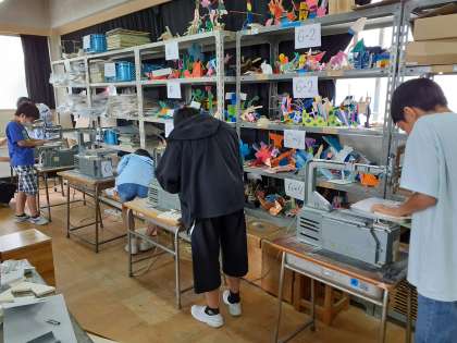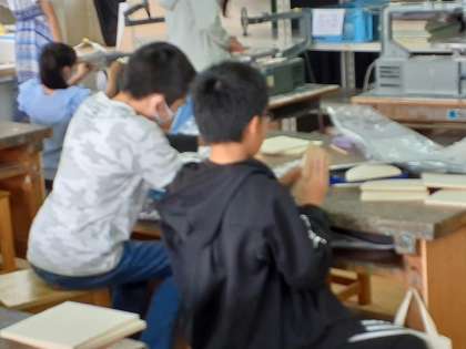 電動のこぎりで、カーブをうまく切る様子が見られます。5年生で活動しているので、技術も身に付いている児童が多いです。