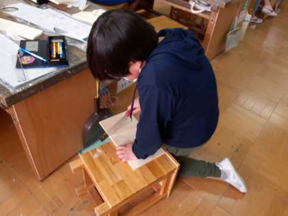 6年生は、90センチほどの長さのベニヤ板を全部使って、作品を作っています。
