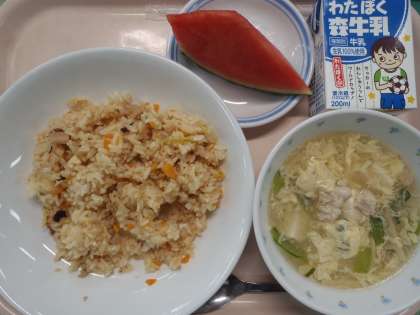 6月7日の給食 公開日 2023/06/07 更新日 2023/06/07 給食 ・タコとキムチのチャーハン ・卵と青菜のスープ ・果物(小玉すいか) ・牛乳 にんじん(千葉) たけのこ(熊本・福岡) 豚ひき肉(宮崎) たこ(北海道) 長ねぎ(茨城) 鶏肉(宮崎) 玉ねぎ(兵庫) 卵(青森) 小松菜(東京) 小玉すいか(熊本) 今日は、たこと白菜キムチを加えたチャーハンです。キムチは辛味の少ないものを使用しているので、キムチの風味が加わったチャーハンになっています。 いいね(0)