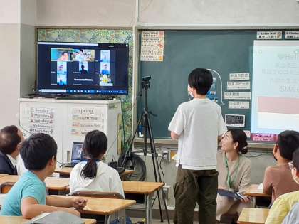 前半には、東根小の代表児童が自己紹介の後、自分たちのすきなこと、スポーツ、食べ物などについて、スピーチをしました。後半は、インドネシアについてのプレゼンを聞き、お互いに質問をし合いました。