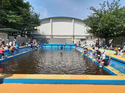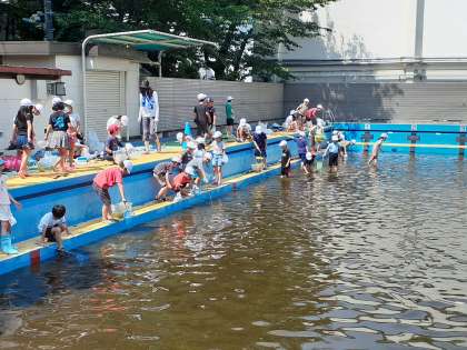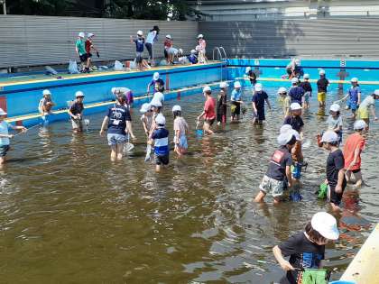 泥水のプールに入り、「2ひき捕まえたよ」という子どももいれば、「捕まえられなかった!」と残念そうにする子どもも。