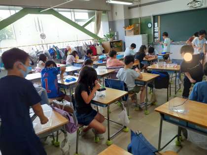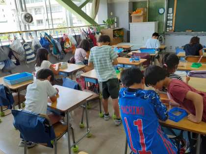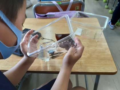 教室に戻って、一人ずつやごをケースに入れ、真剣にやごを見つめていました。とんぼになるのが楽しみです。