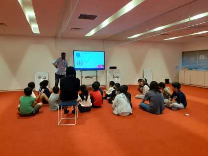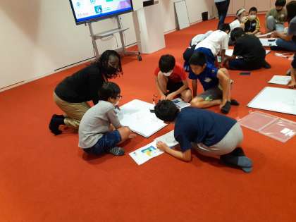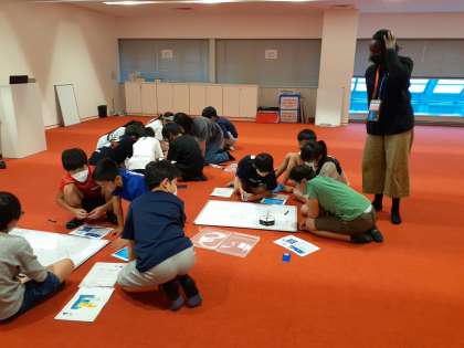 三角形、四角形、星形、などの図形をプログラミングしてロボットに作図させる活動です。英語での説明を聞き、正確にかくために頭をはたらかせていました。