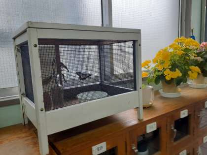今朝の全校朝会でも紹介をしました。かごは狭いので、これから外に逃がしてあげる予定です。