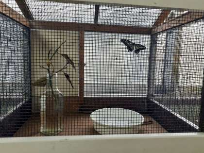 東根小の正門そばの昇降口で、校庭のミカンの木にいたアゲハチョウの幼虫を飼っていました。先週はサナギで過ごしていて、